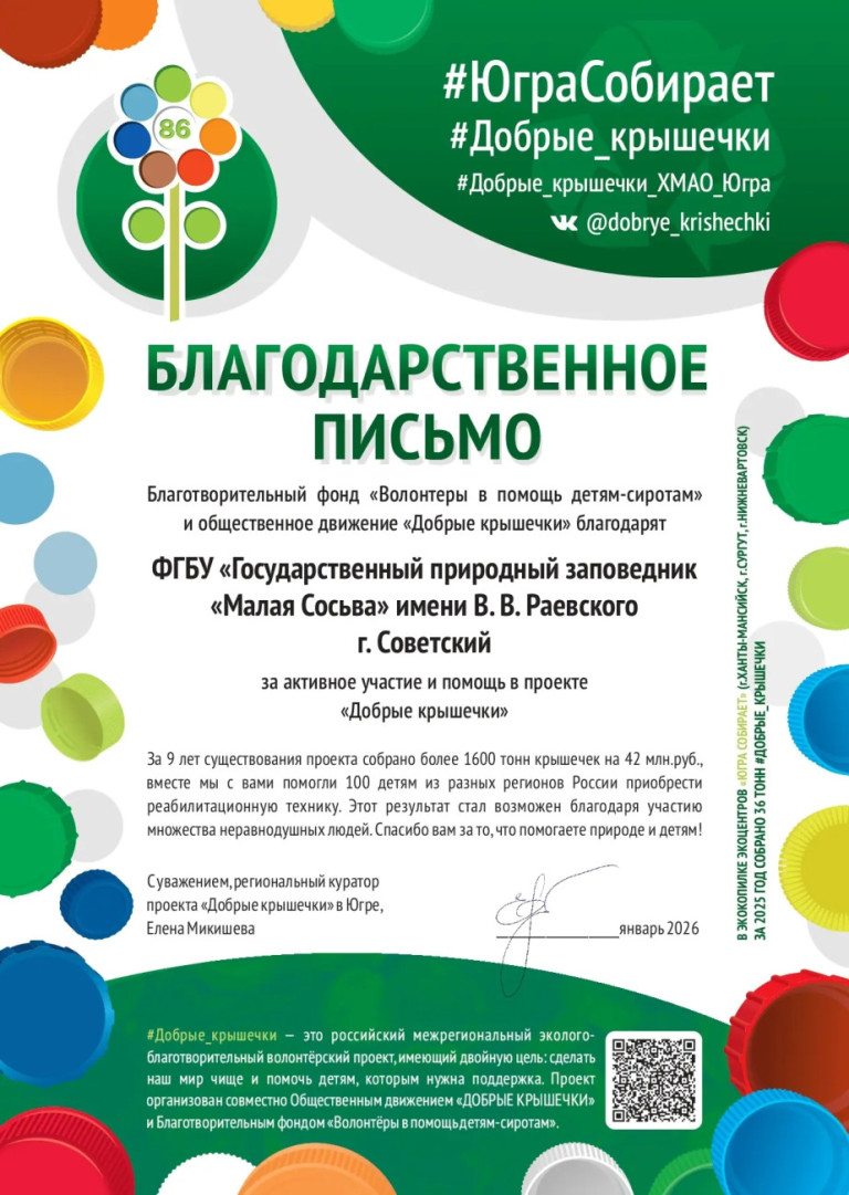 Переработка отходов позволяет сохранить запасы природных ресурсов и проявить заботу об экологии планеты. Ежегодно жители России выбрасывают около 70 млн. тонн бытового мусора, который вывозится на свалки и полигоны или сжигается в печах, что не является рациональным использованием большинства отходов. 18 марта с 2018 г. отмечается Всемирный день переработки отходов. Современные способы переработки мусора не только помогают сберечь природные ресурсы, но и позволяют получить существенную экономическую выгоду. Вторсырье сокращает выбросы более чем 700 млн. тонн углекислого газа в атмосферу в год. Переработка большинства отходов стоит дешевле, чем производство изделий из природного сырья и материалов. Фасовка отходов и отправка их на предприятия по переработке и производству вторсырья стоит на повестке у многих стран мира, граждане которых обеспокоены состоянием окружающей среды. Заповедник «Малая Сосьва» организовал дополнительный пункт приема макулатуры, отработанных батареек и пластиковых крышек: г. Советский Ленина,46. Прием ежемесячно 10-го числа с 14.00 – 16.00. Как собирать: организовать бокс для крышек и батареек, коробку для макулатуры. Принести собранное вторсырье по указанному адресу, получить сертификат участника Акции и печатную продукцию от заповедника «Малая Сосьва». P.S. «Добрые крышечки» – это российский эколого-благотворительный волонтерский проект, имеющий двойную цель: сделать наш мир чище и помочь детям, которым нужна поддержка. Средства, полученные от сдачи крышечек на переработку, будут направлены в благотворительные фонды, осуществляющие деятельность по оказанию помощи детскому населению. Общими усилиями населением Советского района и г. Югорска уже собрано и сдано на переработку в 2026 году: 140,55 кг «Добрых крышек» и 23,12 кг батареек в экоцентр «Югра Собирает» (г. Ханты-Мансийск). Готовится к сдаче партия макулатуры. Приглашаем всех желающих, вне зависимости от возраста и рода деятельности, принять активное участие по сбору вторсырья! #ЗаповедникМалаяСосьва#ЮграСобирает